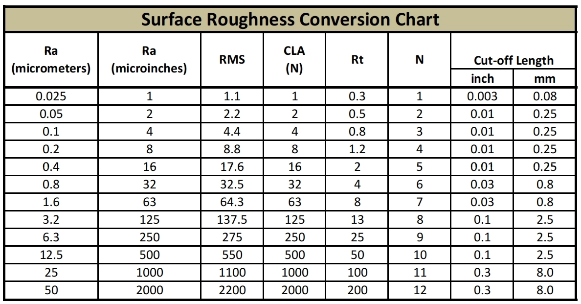 There is a table below shows the comparisons of various surface roughness scales. The information contained in the table is based on the assumption that metal surfaces are being tested, kind of visual inspection and has subjectivity judgement , so the comparison values may vary by up to 25% and for reference only